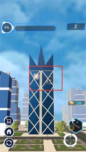 2、注意观察红色框标注的高楼上部目标区,该位置通常是承重墙所在,击中后可触发连锁坍塌效果。
