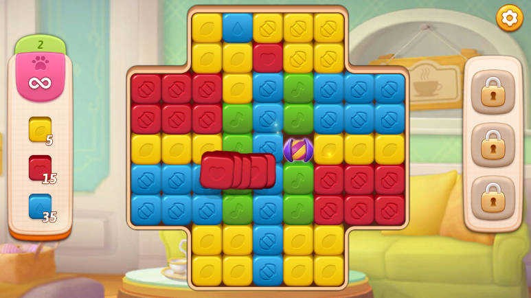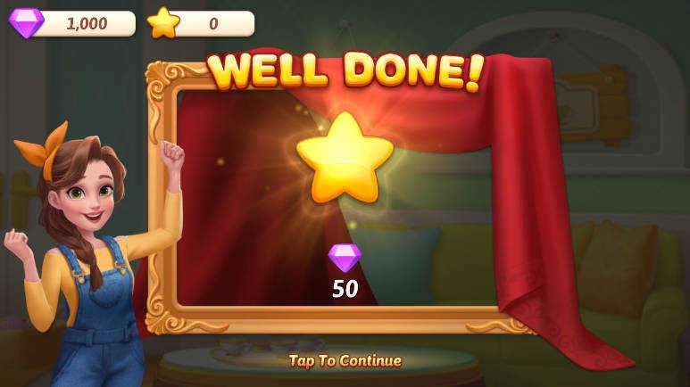 每完成一关三消谜题即可获得“星星”,用于解锁装修步骤(例如清理大厅、粉刷墙面、添置家具等)。