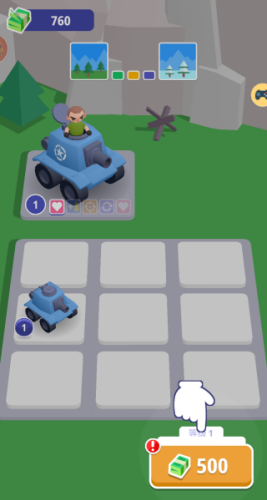 3、跟着手指的指示去点击500,花费500你可以购买一个坦克,放置到格子里。