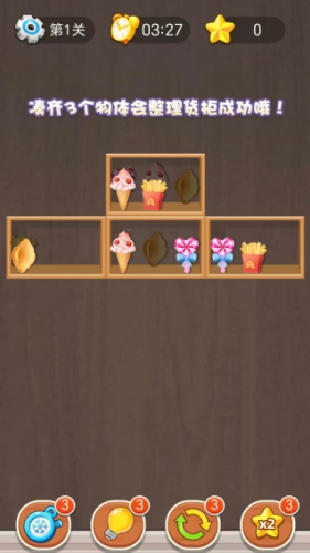 3、快速扫描货柜,优先处理那些已经自然形成两个相邻的同类物品,凑齐三个相同的物品就能消除成功。