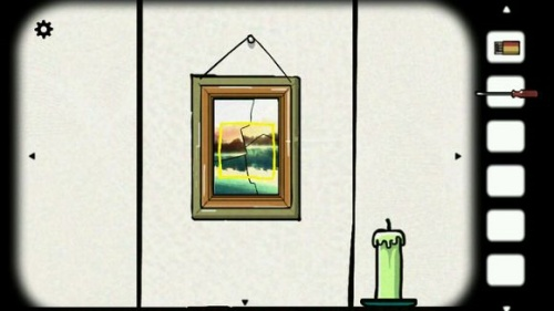 2、我们依然先是默认的面对有大型钟的这面,在盆栽柜子上拿到望远镜,然后一直点击盆栽,就发现一直手深了出来,又缩了回去,可以拿到第一篇相框碎片。抽屉里面可以取得螺丝刀,火柴,柜子边上还有一片碎片,房间钟的上方也可以取得一片碎片。