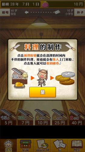 1、简易经营流程:游戏采用简单直观的操作方式。点击料理按键并消耗相应硬币,老奶奶就会在指定时段内持续制作食物。飘散的香气会吸引客人陆续上门,玩家只需轻触客人形象即可完成收银。