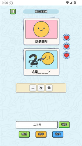 这是谐音梗安卓下载最新版本是一款爆笑又上头的谐音梗益智闯关游戏,游戏设计了超多超级搞笑的关卡,玩家需要根据关卡图片上给出的提示才出各种谜题,这样一来就能够给玩家带来非常爆笑的游戏体验,能够很好的体验到文字所带来的魅力,能够很好的用来打发无聊时间。游戏有着数百个关卡,每一关题目都是独立的有三次答题机会,需要多观察图片含义反复推敲给出答案,难度层层递进不断找出答案十分有成就感,游戏整体玩法非常休闲,在游玩娱乐的同时还能激活自己的大脑,享受轻松愉悦的游戏乐趣。
