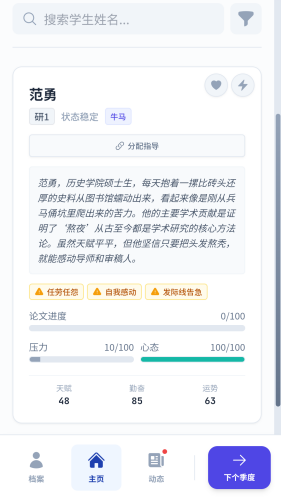 游戏界面模拟高校官网,包含个人简介、研究方向、招生要求等模块,甚至学生面试、项目申请被拒等细节都还原现实场景,让玩家快速代入角色。