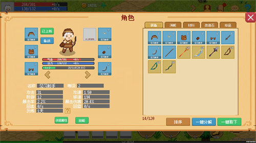 2、点击右上角的角色可以查看自己的属性、职业以及拥有的装备。