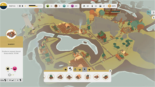 面包店制作面包速度较慢,可建造多个采集者小屋来回流动采集,以满足食物需求。