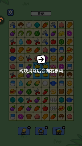 2、除了第一关,接下去的关卡,消除后砖块会向不同的方向移动。