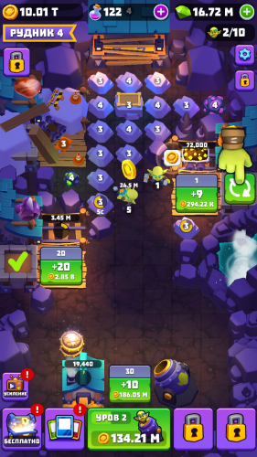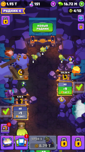 2、以哥布林矿工挖掘黄金为背景的放置合成模拟经营游戏,玩家在游戏中雇佣并合成哥布林矿工。