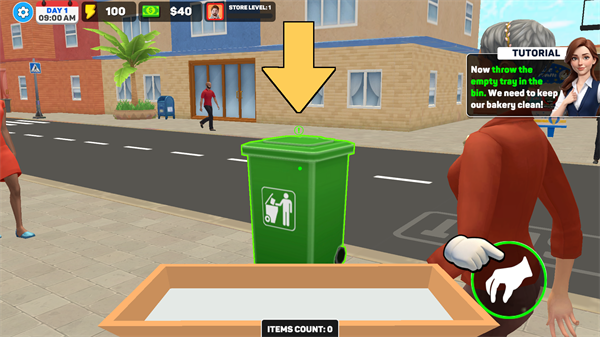 3、靠近垃圾桶点击手就可以把垃圾丢了。