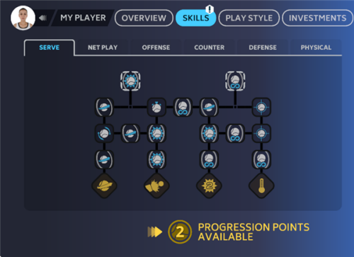 9、在【SKILLS】界面共有6个技能树,通过解锁属性来进步,玩家可以使用每次升级获得的进阶点来塑造你想要成为的球员。