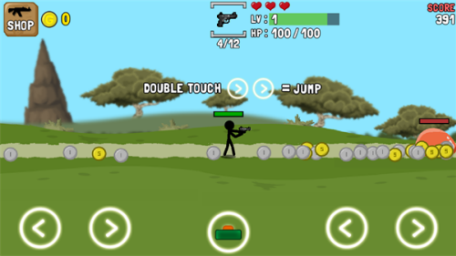 5、需要两个手进行操作,左手控制人物的前进、后退、跳跃或是卧倒,右手决定设计点。若是玩家击中敌人就会对其产生伤害,爆头可以一击毙命。因为子弹用完还要点击进行补充,这之间会要一定缓冲时间,因此尽可能的一击爆头,如此可以省却子弹。