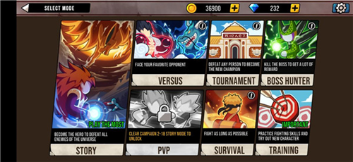 2、这里有很多玩法等着玩家前来体验,比如:PVP模式、对战模式、故事模式、锦标赛模式、Boss猎人模式、训练模式等有些需要观看广告