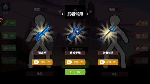 3、包含武器试用功能,像火箭筒、传送枪等武器可试用,还有皮肤、颜色选择及左手模式,个性化设置丰富。
