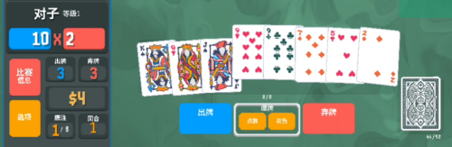 3、玩家初始携带52张扑克牌组,手中始终保持8张牌,出牌或弃牌后自动补满,但次数有限。