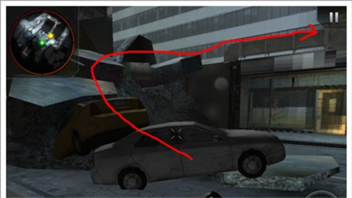 4、抵达这个地形区域后,不必急于朝着小地图的指示方向前进,而是应该向左滑动屏幕,沿着另一条路径登上房顶。