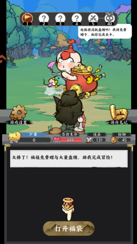 1、下载字走山海,登录进入游戏,点击打开福袋领取初始盘缠,开始闯关。