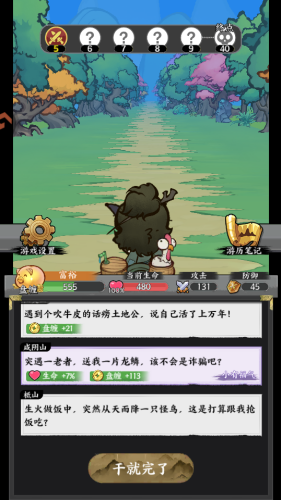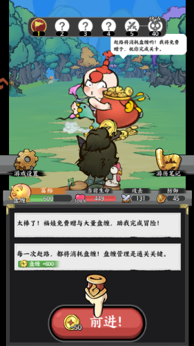 2、点击前进消耗盘缠进入下一个节点,如果盘缠不足则会消耗生命值,会碰见不同的随机事件或者战斗,玩家的通关目标就是达到终点节点并击败boss。
