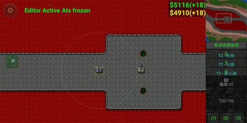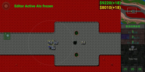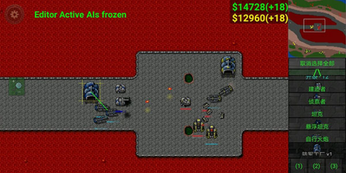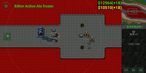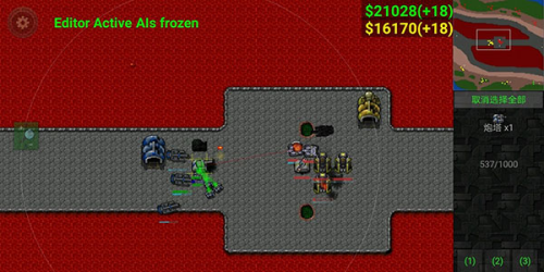 6、使用激光坦克(图片情况是假的),因沙盒模式原因很难模拟正常情况,因为钱不够的原因四号要出激光坦克在激光防御上有极大欠缺,三号只需火炮集火激光坦克,并用建造修塔,而四号的激光坦克难有输出机会大概率白给,为减小损失回收二级陆工,三号顺利拿下中。以上为我遇到的对抗火炮的方法,均以失败告终,目前尚未遇到能对付的方法(好像只有我一个人用,那就叫雪风式火炮流好了)。