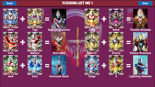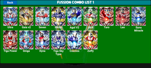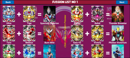5、设置有合成表方便用户进行合成,如fussion list查看欧布奥特曼不同形态的合成方式。