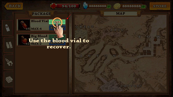 4、来到地图界面,左边的背包,右边是地图,背包第一栏是药剂,需要使用药剂时点击药剂的“use”就可以使用了。