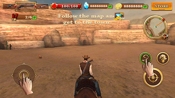 5、提供8套牛仔服装、30种武器和6匹风格各异的马匹,还有众多游戏道具。穿上炫酷的服装,骑上漂亮的骏马,配备强大的武器,展现你的牛仔风采。