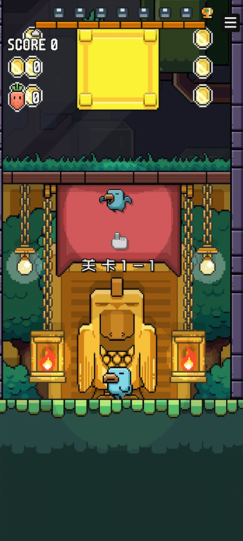 1、点击或长按屏幕控制鸟类收集胡萝卜和金币,注意避免障碍物。