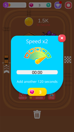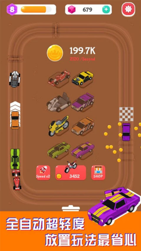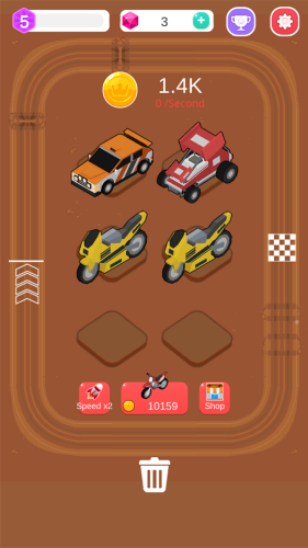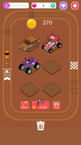 将合并出的汽车放置到赛道上,它们就会自动生产金币。车辆级别越高,产生的金币越多。