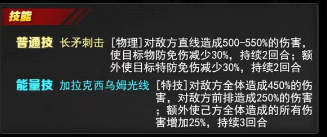 普通技:长矛刺击:对敌方直线造成 500-550%物理伤害,降低目标 30%物防免伤与30%特防免伤(均持续 2 回合)。