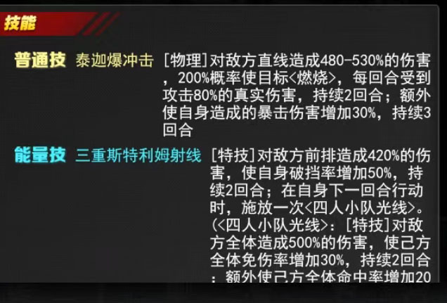 能量技:三重斯特利姆射线:对敌方前排造成420%特技伤害,自身破挡率+50%(持续2回合),下一回合行动时释放【四人小队光线】(对敌方全体造成500%特技伤害,己方全体免伤率+30%、命中率+20%,均持续2回合)。