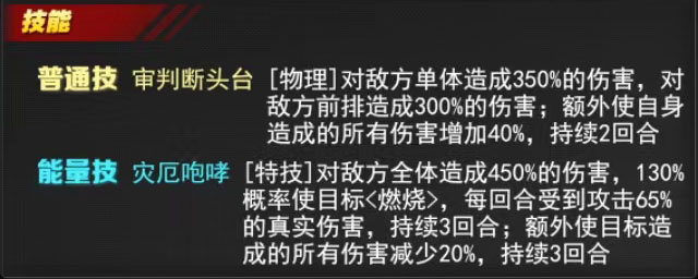 普通技:审判断头台:对敌方单体造成350%物理伤害,对前排造成300%物理伤害,自身伤害+40%(持续2回合)。