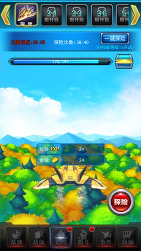 2、当玩家角色等级达到7级时就可开启【探险】功能,而在13级时将会开启【一键探险】功能,彻底解放奥粉们的手指。每一次探险都是一种充满期待的旅程,因为每一次探索不仅能获得金币、经验还有各种随机的奖励,而与这些相对应的是探险宝箱的开启。每次探险都会根据场景获得进度,值得一提的是进度还能造成暴击哦,随着不断的探险,当进度条被充满时我们就可开启神秘的宝箱啦。