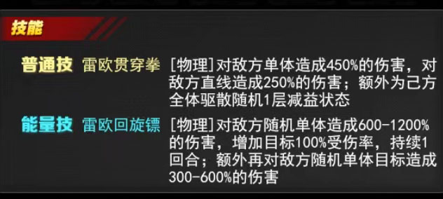 能量技:雷欧回旋镖:对敌方随机单体造成600-1200%物理伤害,目标受伤率+100%(持续1回合),额外对随机单体造成300-600%物理伤害。