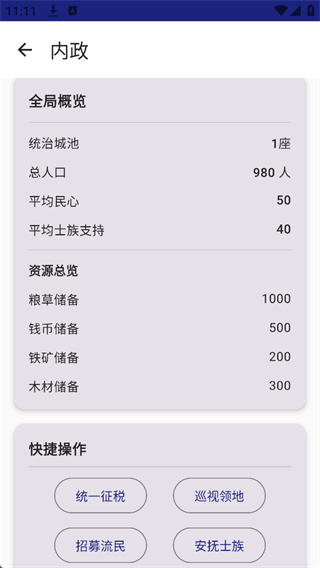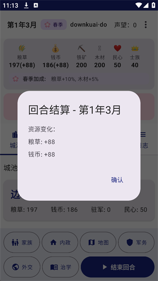 资源消耗:前3回合专注攒资源,不盲目征兵或扩张,确保民心与士族支持稳定,避免叛乱。