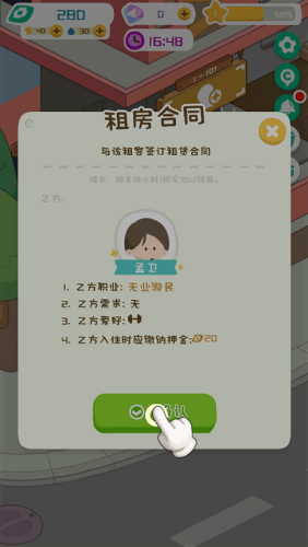 4、玩家是一名房产大亨,玩家需要将各个房屋进行出租来收获奖励。