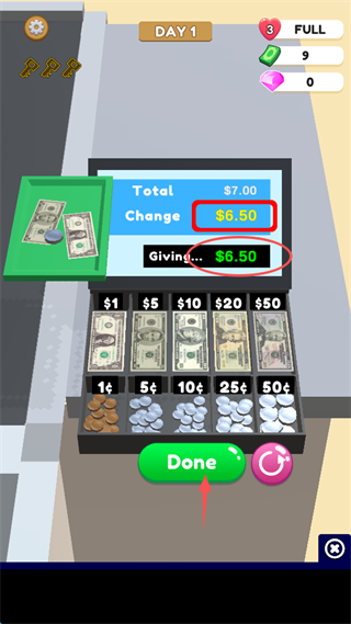 6、由大到小的数额找零,随后点击屏幕下方的“Done”。