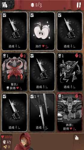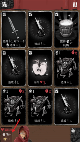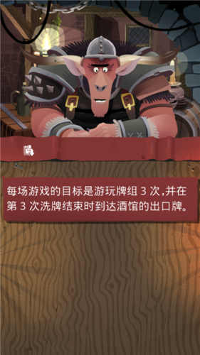 1、每一场游戏的目标就是游玩牌组3次,并在第三次洗牌结束的时候到达酒馆的出口牌,一场完整的冒险包括5个酒馆,其难度和挑战逐步增加。