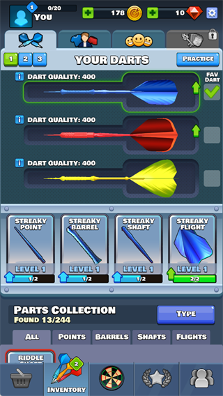 2、通过玩此款游戏并赢得比赛,您可解锁各种新的道具,并可将其用于定制您的飞镖!使用新的镖筒、镖杆和镖翼,您的飞镖将有独特的外观并获得性能提升;
