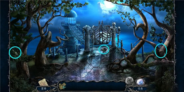 3、进入花园点击左上角的建筑花纹达成3/22成就【侦探】,接着拿走喷泉池里的「铲子」,然后再拿走右边藤蔓上的「干苔藓」。