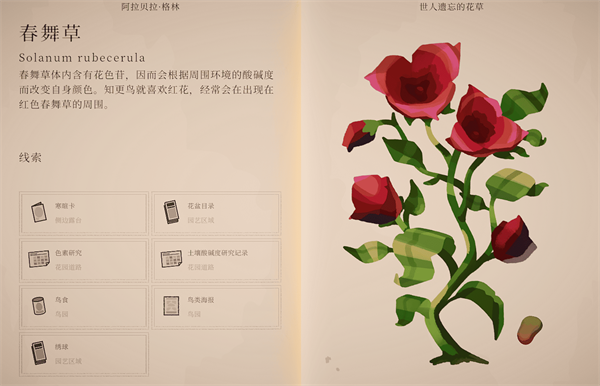 在鸟类海报确认花园道路栖息的知更鸟授粉红花,确认适宜红花生长的pH 12-14内的唯一组合砂岩盆+海藻pH 13.2。把砂岩盆种植并浇水、海藻滋润过的幼苗放在鸟园内,用两个鸟食盆交替引诱花园道路鸟巢里的知更鸟跟随到鸟园授粉。