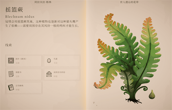 辨别画作《蕨类》上的冠鸮蛋,在阁楼弹奏伴生鸟冠鸮的自然音乐E C D E G F。