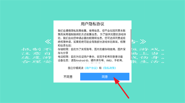 1、首先打开游戏,阅读并同意《用户协议》和《隐私政策》;