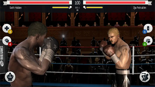 游戏界面上方红色为角色的血条,黄色是角色的耐力, 整个游戏界面都是我们的操作界面,屏幕的左右两边分别是操纵着角色的左手和右手,而屏幕左右两侧有阻挡和躲闪按钮,这是拳击中我们的防御手段