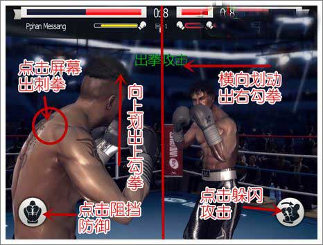 点击左边屏幕,角色出左手“刺拳”,横向划动则出“左勾拳”, 从下往上划则会出“左上勾拳”,同理点击右边屏幕角色就会用右手做出同样的招式。当我们被对手攻击时,点击阻挡或者防御减少受到的伤害,抓住时机反击。