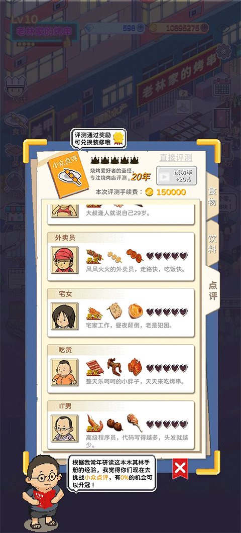 5、通过精心经营和不断升级,玩家可以逐渐扩大烧烤店规模,解锁更多美食和装饰,吸引更多顾客。