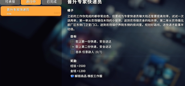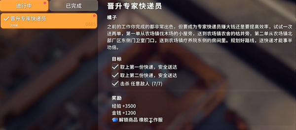 1、玩家可以在橘子那里接取任务任务晋升专家快递员,任务奖励有解锁橡胶工作服。